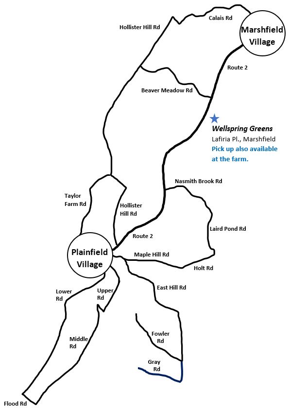 If you live or work along our current delivery route and would like to have a sample of Wellspring Greens delivered to you, select the last item before submitting the form. Thanks!